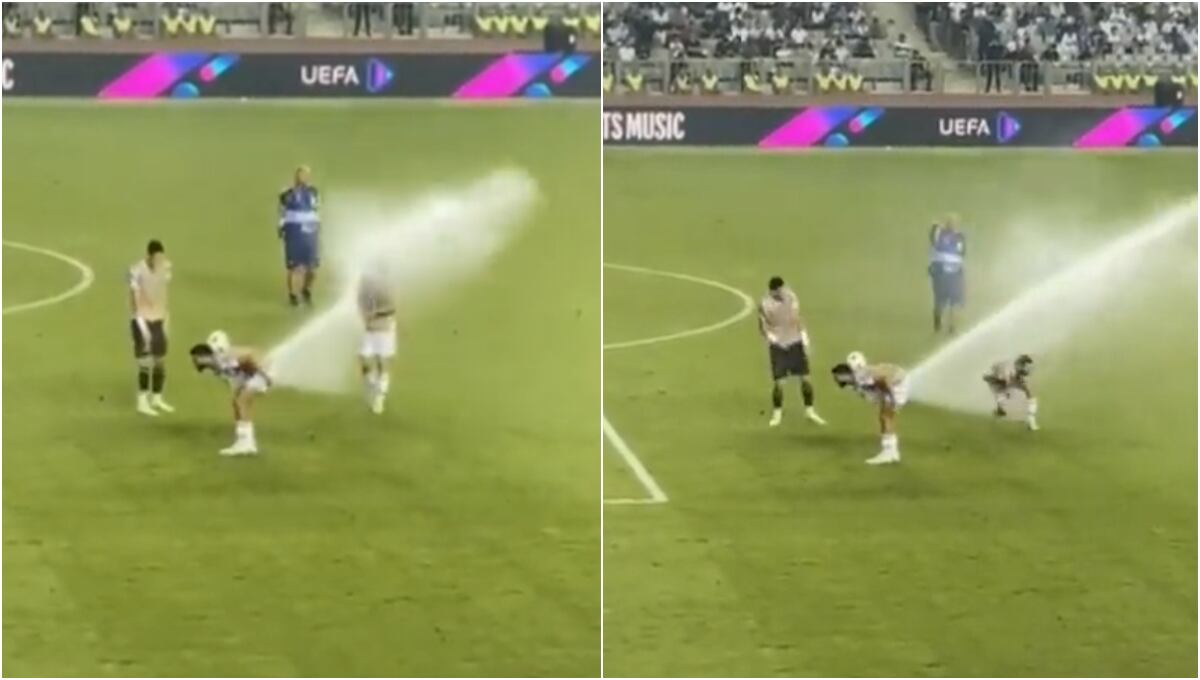 Todo sucedió en los movimientos de calistenia previos a un partido de una competición de la UEFA en la que un futbolista acabó mojado de pies a cabeza cuando los aspersores del gramado se activaron de repente y apuntaron contra el rostro del deportista.