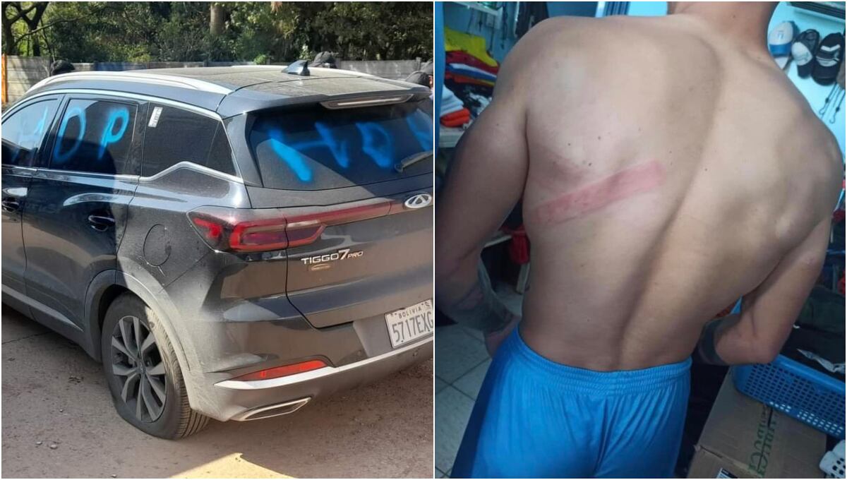 Los supuestos hinchas se dirigieron luego a la zona de parqueo para pinchar los neumáticos y pintarrajear insultos en unos diecisiete vehículos pertenecientes al plantel profesional de la Academia cruceña.