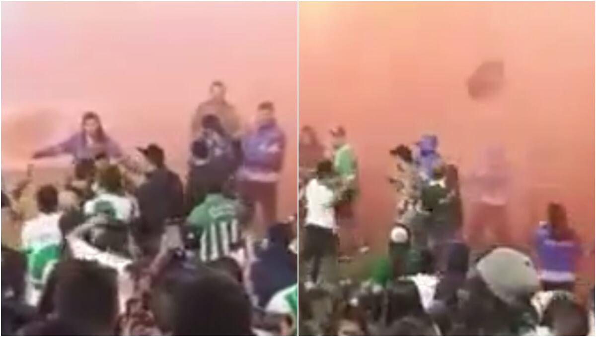 La práctica que es habitual dentro de los estadios, de vaciar extintores con el ‘polvo’ de colores, se salió de lo habitual cuando los hinchas de Medellín lo hicieron justo al frente de donde estaban los de Nacional.