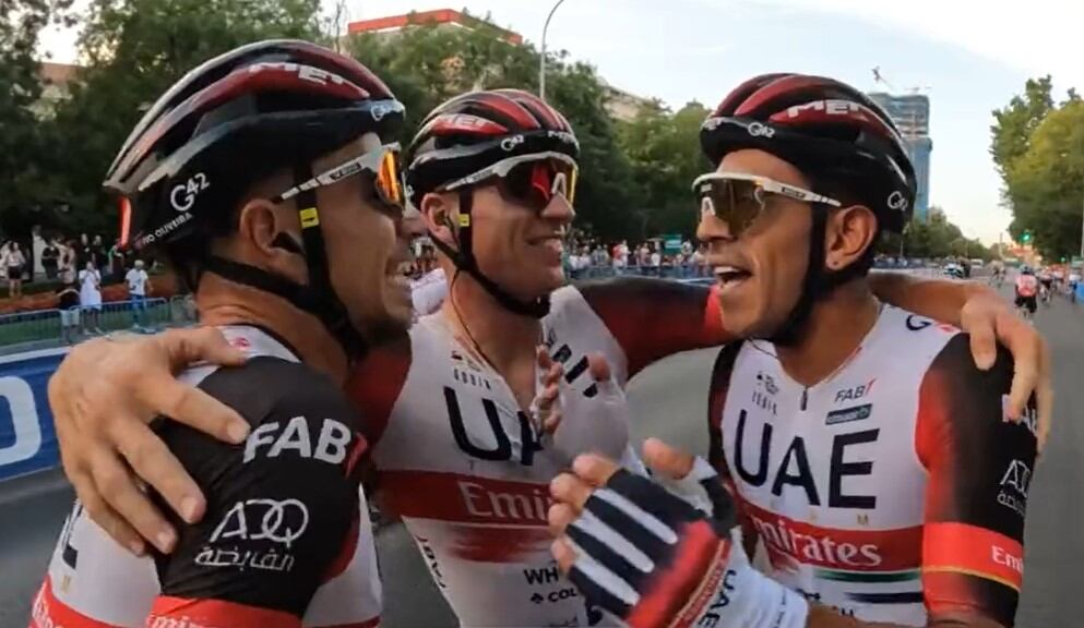 Pedalistas como Marc Soler, Juan Ayuso y Pascal Ackermann se acercaron a Molano. Uno de ellos ni sabía que él había ganado la etapa, por lo que se sorprendió y fue a abrazarlo fuertemente.