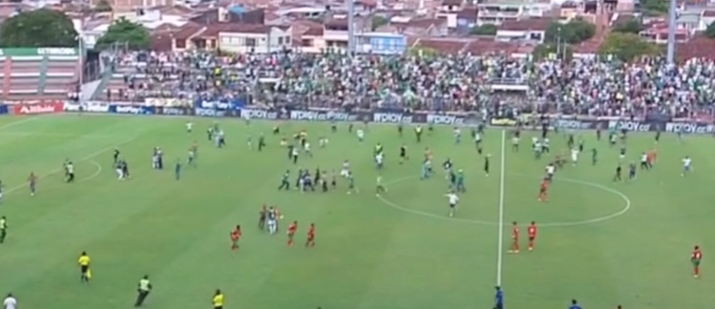 El partido entre Cortuluá y Deportivo Cali fue interrumpido por una invasión de campo de los hinchas del ‘Verdiblanco’ que ingresaron para agredir a sus propios jugadores.