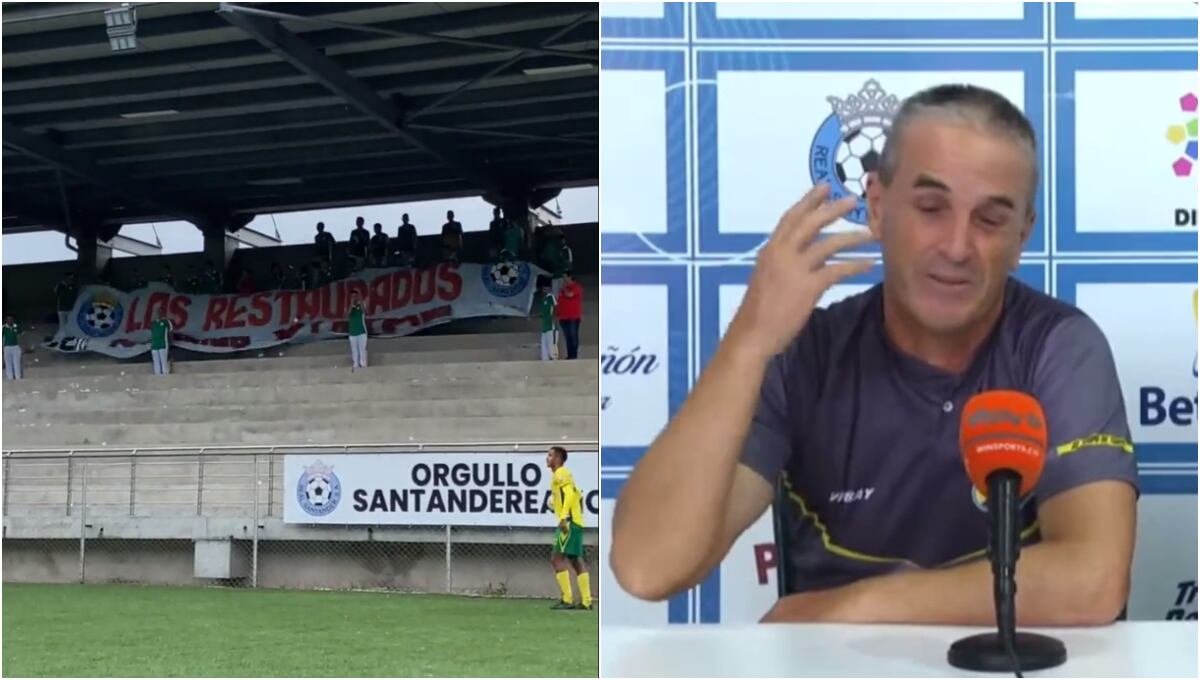 Detrás de los bancos de suplentes del estadio Villa Concha están unas graderías en donde se hace una barra del equipo santandereano que destaca por la cantidad de bombos y trompetas, algo que sin duda no le dejó tener tranquilidad al entrenador.