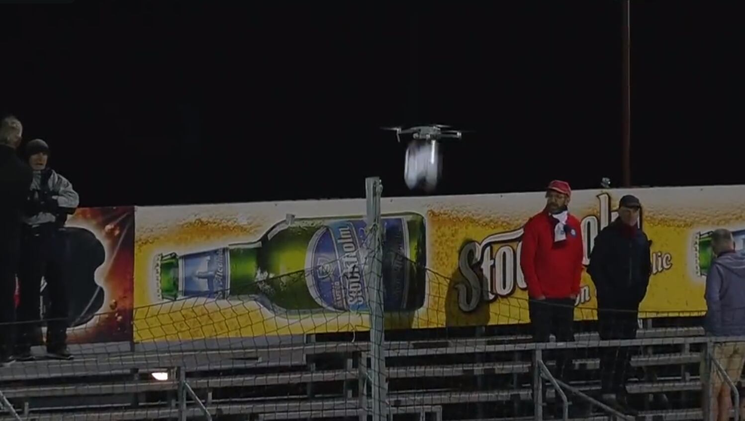 La presencia de un drone en el estadio retrasó el inicio de un partido de fútbol en Suecia, pero un portero solucionó el inconveniente al sacarlo a volar a punta de pelotazos.