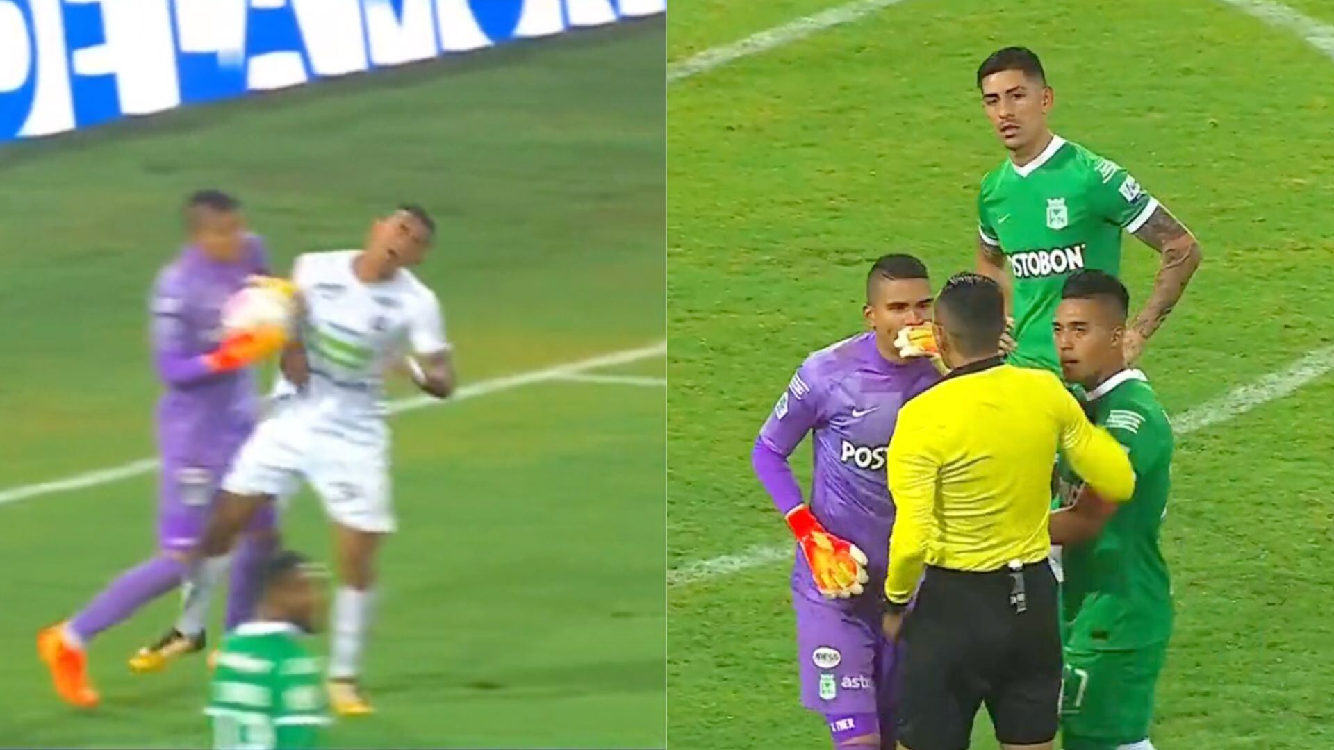 Al jugador del Once Caldas lo tuvieron que atender y el juez central Eder Vergara tuvo que revisar la jugada. Finalmente, el árbitro con a ayuda del VAR decretó penalti y le sacó la tarjeta amarilla al portero de Nacional.
