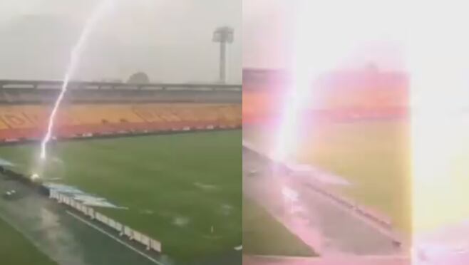 A través de la cuenta de Twitter, se filtró un video en el que caía un rayo en todo el arco norte del Campín. Por supuesto, la preocupación y el asombro no se hicieron esperar. Ya los protagonistas debían entrar para hacer su calentamiento, pero por obvios motivos, no se pudo efectuar.