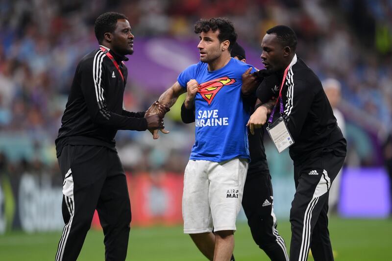 El aficionado ingresó al terreno de juego con una bandera LGTB+ en mano y una camiseta de ‘Supermán’, que por delante decía “salven a Ucrania” y por detrás reclamaba “respeto por la mujer iraní”. Aunque en video no se pudo observar para el mundo, en algunas fotografías quedó registrado el suceso.