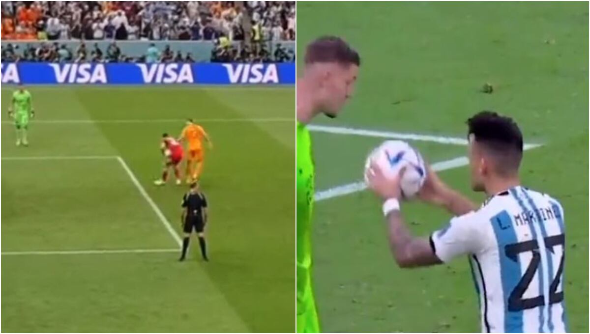 Al final, fue Lautaro Martínez, cuando el portero neerlandés le llevó el balón, el que lo alejó poniendo el balón contra el abdomen y luego simuló lanzarle un pelotazo en el rostro.