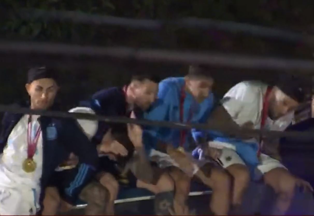 Cinco de los jugadores de la Albiceleste tuvieron que agacharse, al estar en el techo del autobús, para intentar esquivar un cable de los que están tensionados entre los postes.