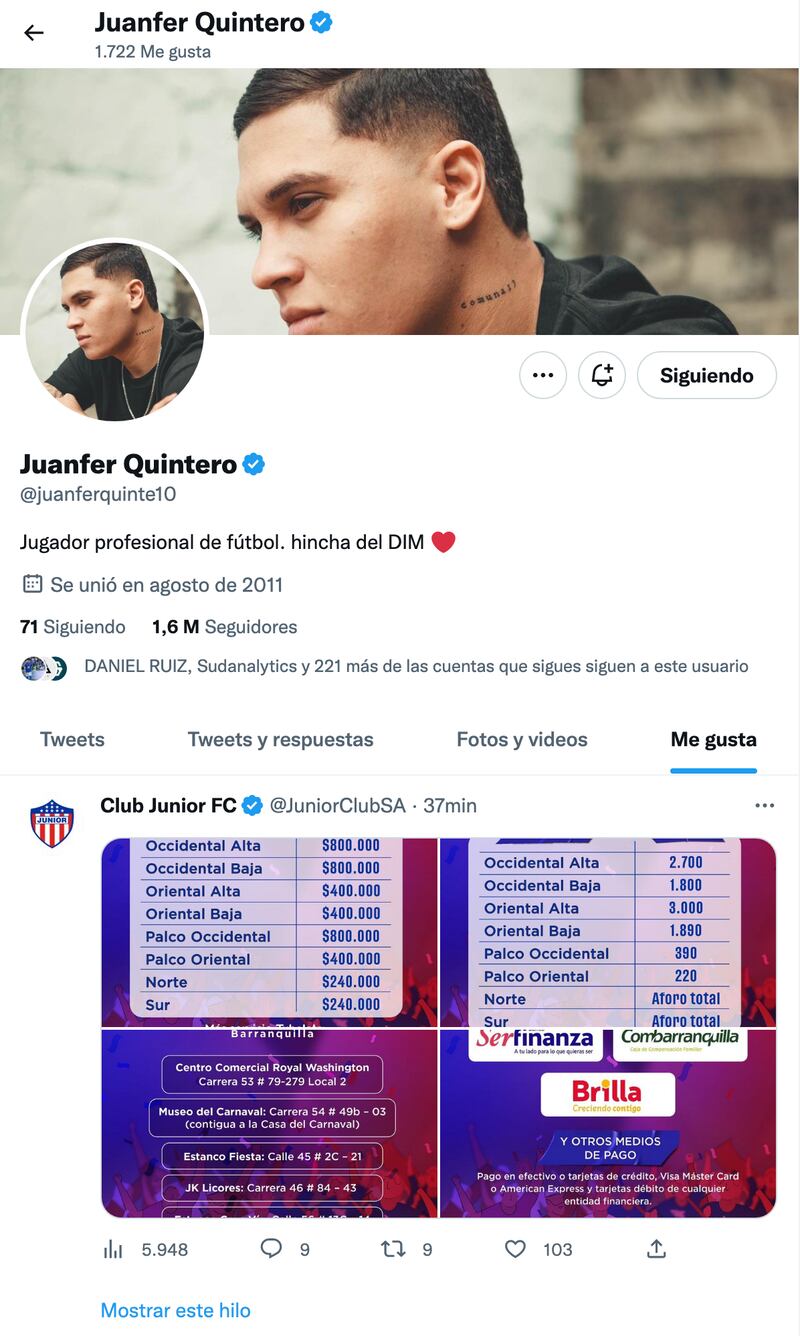 Las especulaciones de los hinchas aumentaron en cuestión de minutos por algo que hizo el propio Juan Fernando Quintero. El talentoso volante le dio me gusta a la publicación del Junior en Twitter, lo que muchos consideraron como un guiño que confirmaría su llegada al ‘Tiburón’.