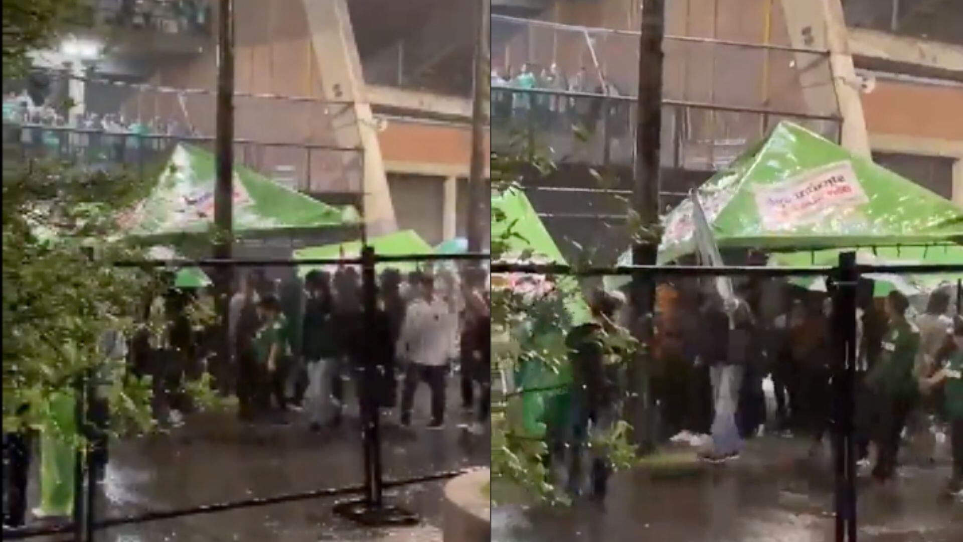 En redes sociales se hizo viral un video en el que un grupo de hinchas se las ingenió para improvisar una carpa de uno de los patrocinadores como sombrilla para poder movilizarse sin tener que sufrir la intensa lluvia que había en ese momento y dejar claro el adagio popular que indica que “un paisa nunca se vara”.