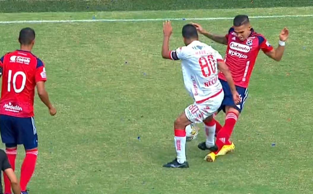 Marrugo le entró con todo a Jonathan Marulanda, cuando no iban ni dos minutos de juego y tras la revisión del VAR se fue expulsado.