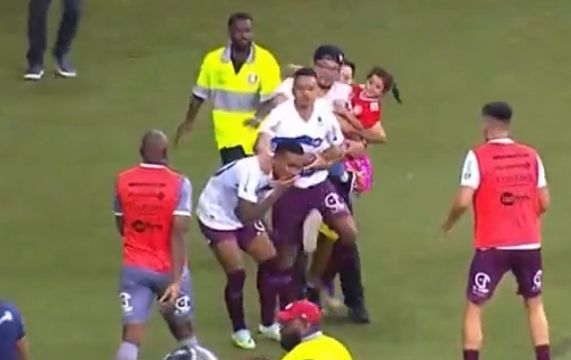 El hombre que llevaba una niña en brazos corrió directo a uno de los jugadores de Caxias al que le metió una fuerte patada, por la espalda, en toda la entrepierna.
