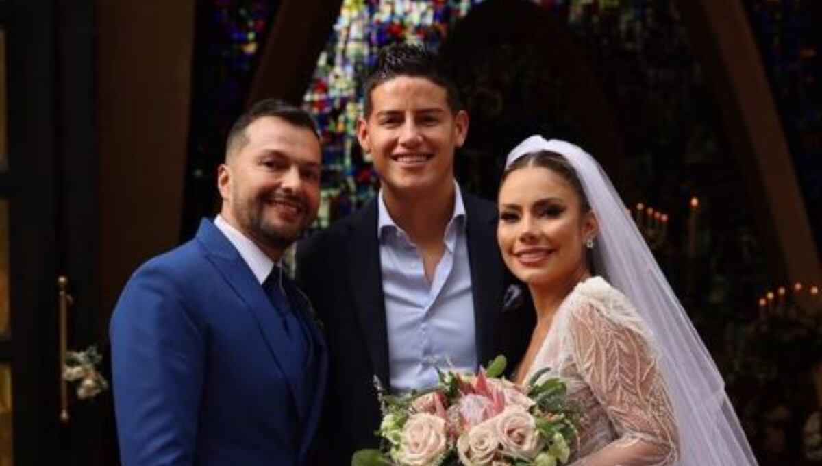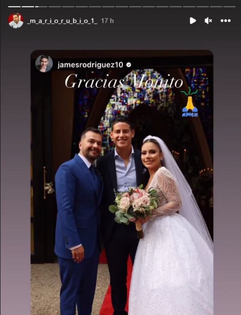 James Rodríguez compartió una primera imagen junto a los dos novios y les deseó: “Que sean felices”, la misma fue respondida por el novio que le puso: “Gracias, monito”.