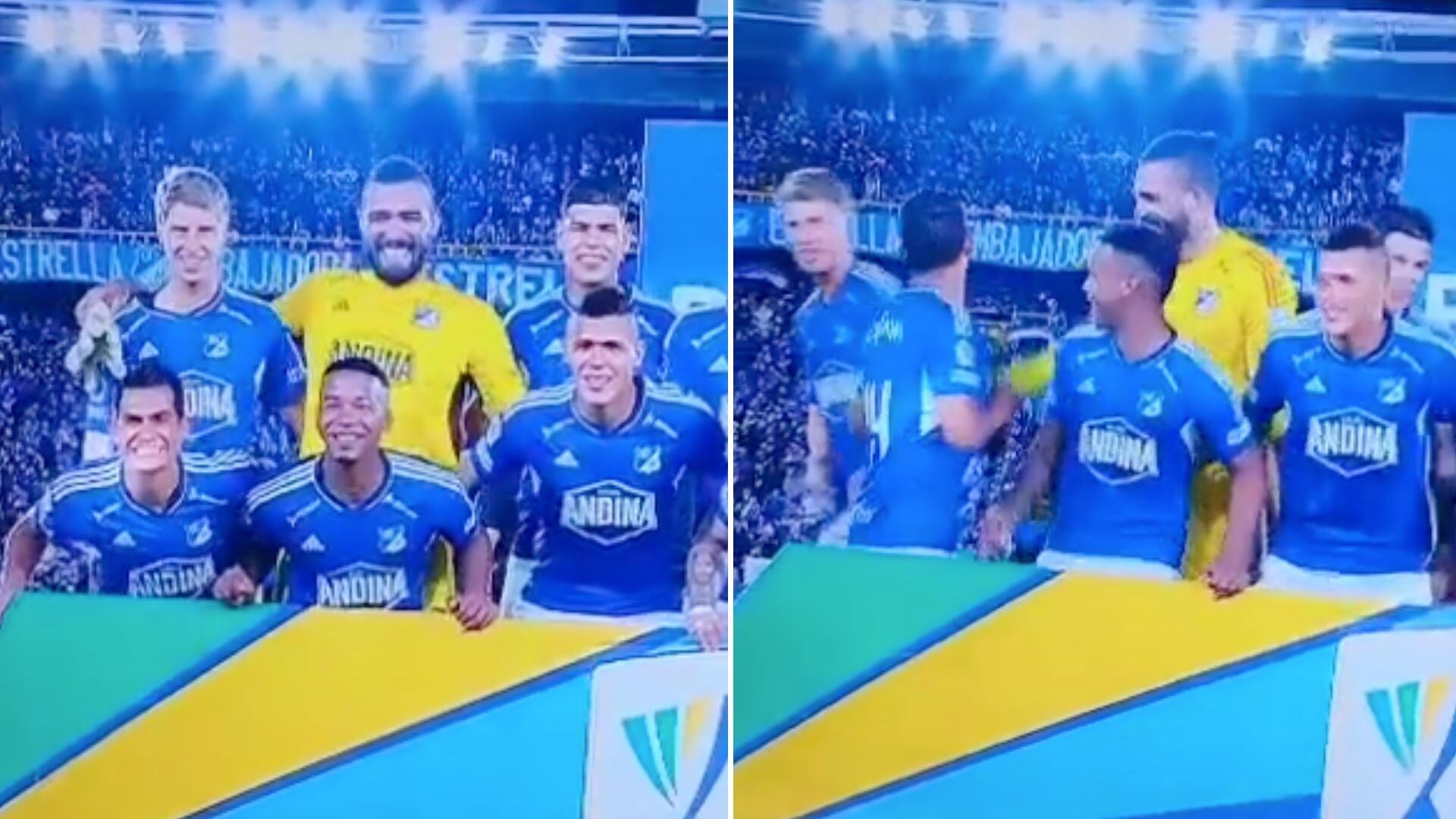 Antes de iniciar cada encuentro, los jugadores de cada equipo se reúnen para la foto grupal y Millonarios lo hace de una forma particular. Por supuesto, más allá de la seriedad del momento, Álvaro Montero aprovecha para bajarle la tensión al momento con un gesto curioso.