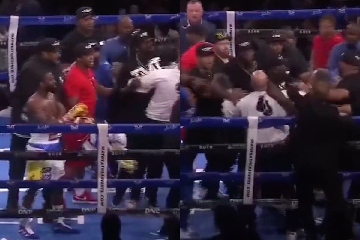 Floyd se quitó algunos golpes y tuvieron que intervenir los equipos de cada esquina, pero todo se salió de control cuando algunos aficionados ingresaron al ring, situación que parecía incontrolable.