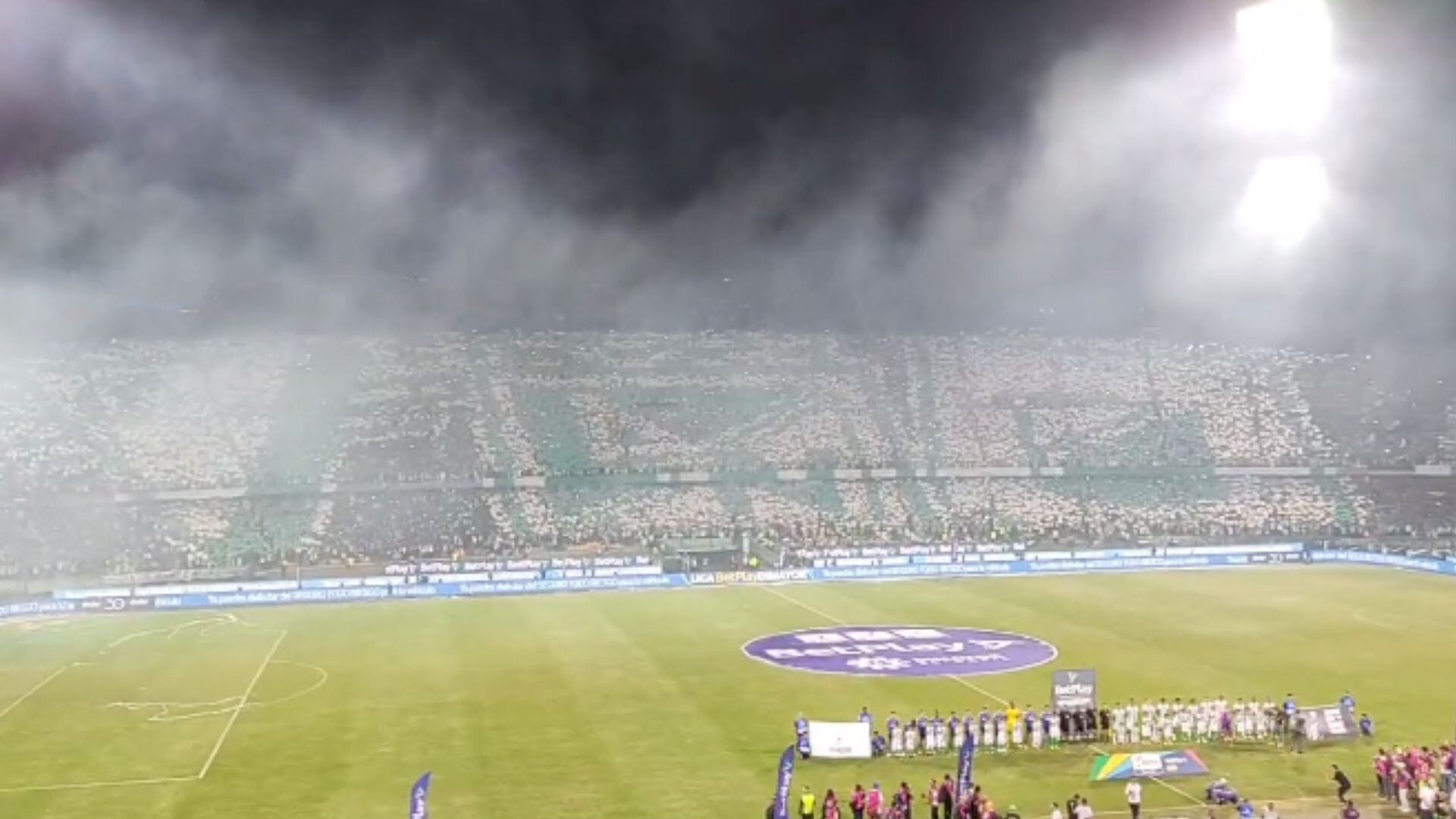 Primero, los flashes de los teléfonos móviles prendieron la fiesta en un estadio pintado de verde. Luego, en el momento de los himnos, se desplegó el tifo que habían indicado en la previa y para el que fueron ubicados los plásticos en cada uno de los asientos de las cuatro tribunas.