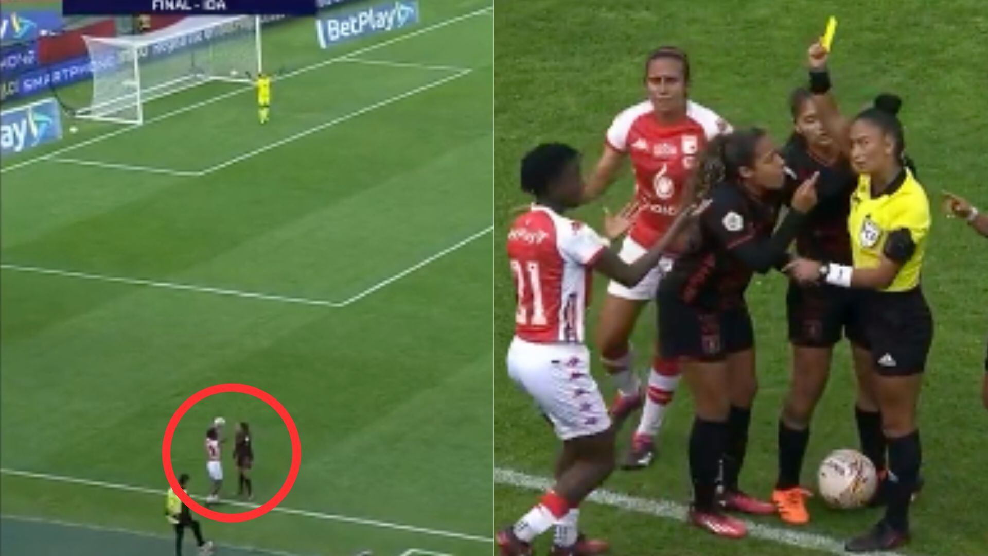 Las capitanas Catalina Usme (América) y Gabriela Huertas (Santa Fe) llegaron para bajarle los ánimos a esta situación, pero finalmente la juez central le sacó tarjeta amarilla a las dos jugadoras implicadas en el hecho.