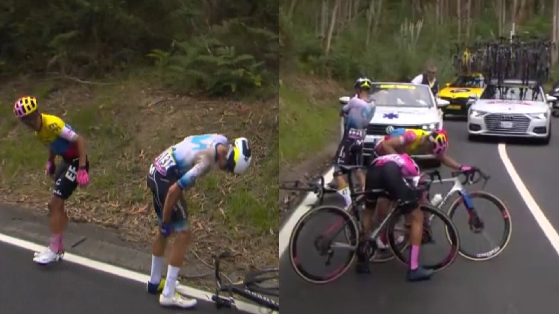 Cuando faltaban poco más de 22 kilómetros para la meta, Richard Carapaz, integrantes del EF, el equipo de Rigoberto Urán, y Enric Mas, del Movistar, sufrieron una fuerte caída. Ellos iban en descenso y una curva provocó que se chocaran. Inmediatamente, Carapaz y Mas intentaron levantarse, pero tardaron en reincorporarse y, de hecho, uno de ellos abandonó la competencia.