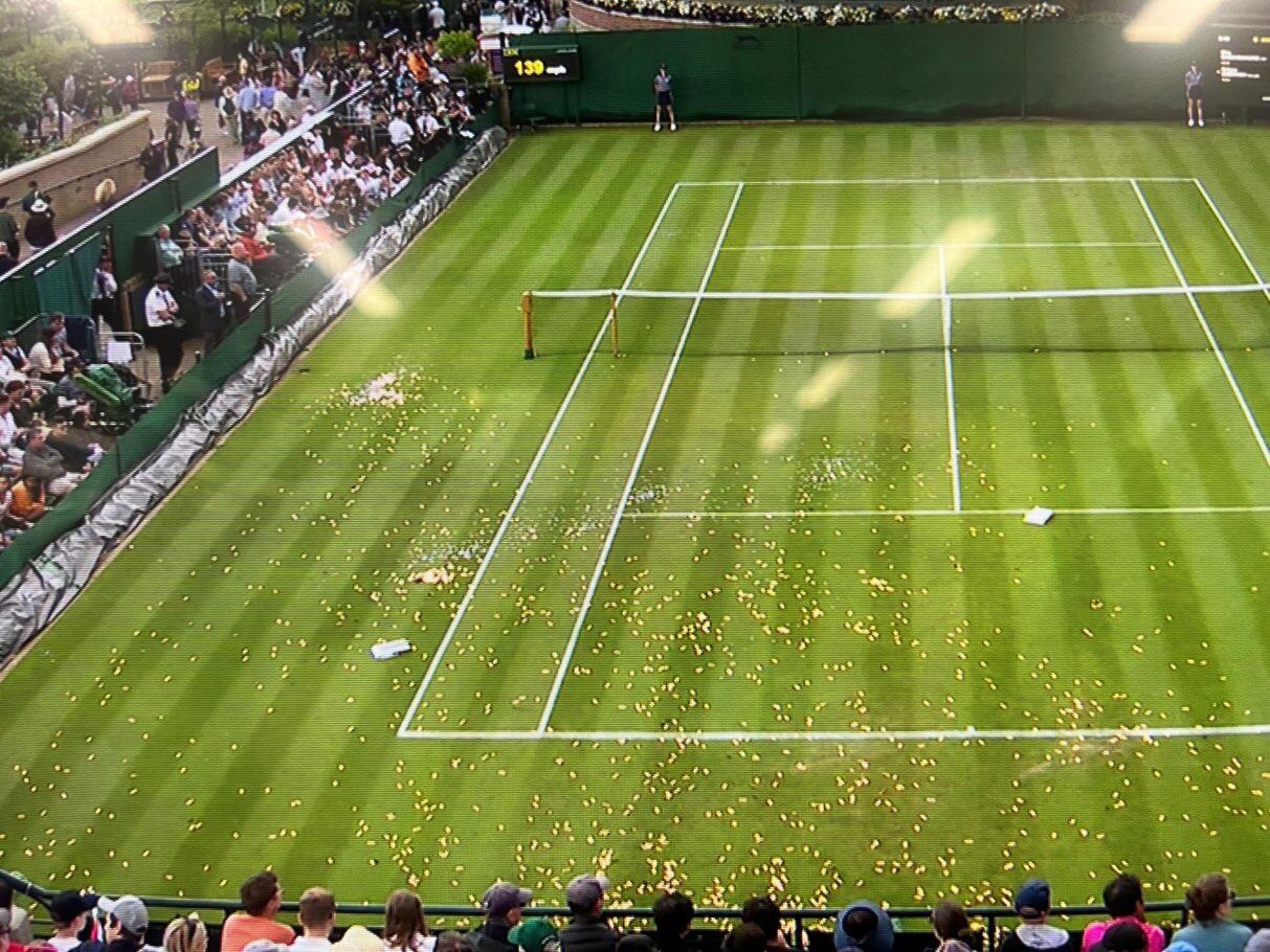 Dos manifestantes de la plataforma ‘Just Stop Oil’, que pide la prohibición de los combustibles fósiles, interrumpieron uno de los partidos de Wimbledon para lanzar confeti naranja al césped.