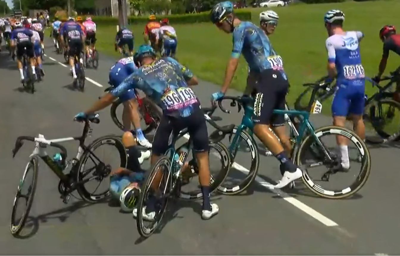 Cavendish se fue a tierra junto con otros ciclistas, como el español Pello Bilbao, y no pudo reintegrarse a la carrera, con ostensibles gestos de dolor en la clavícula izquierda.Atendido por los médicos sobre el asfalto, el corredor no pudo reincorporarse al pelotón.