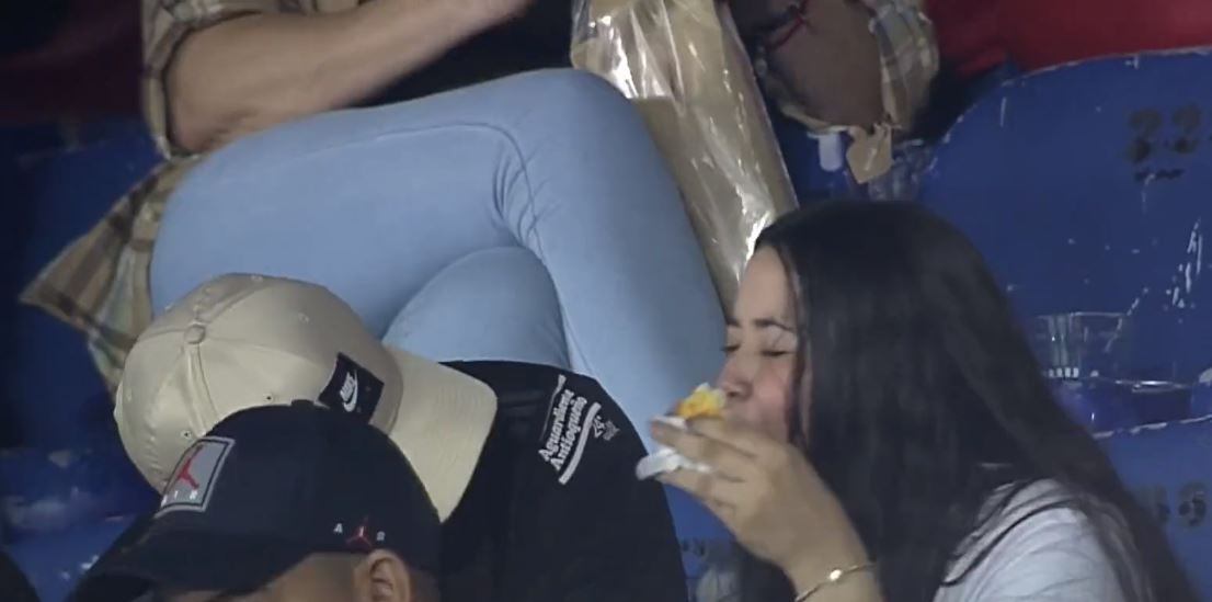 La Kiss Cam de Win Sports en el fútbol colombiano volvieron a hacer de las suyas y en esta ocasión una pareja que fue captada en el Estadio Metropolitano de Barranquilla pareció quedar en evidencia al verse en la pantalla gigante. El hombre quedó helado y la mujer por poco escupe la empanada que se comía.