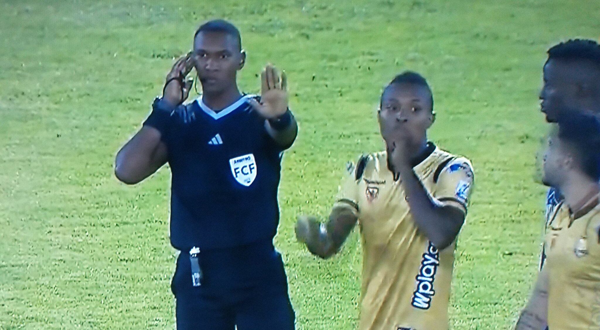 De manera impensada, Jean Pineda simuló la señal del árbitro y señaló al medio del campo, imitando un pito entre sus manos para anticipar la decisión de gol legal.