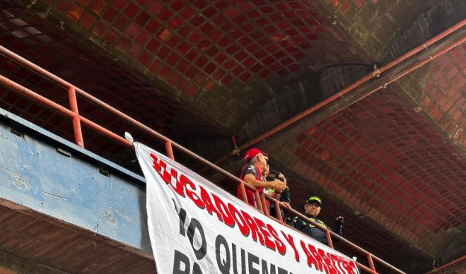 “La pancarta que se encontraba en la tribuna occidental del Estadio General Santander. Duró puesta unos pocos minutos. Recién inició el compromiso, la Policía Nacional dio la orden de retirarla”, reportó Ricardo José Durán, periodista del canal Win Sports en la ciudad de Cúcuta.