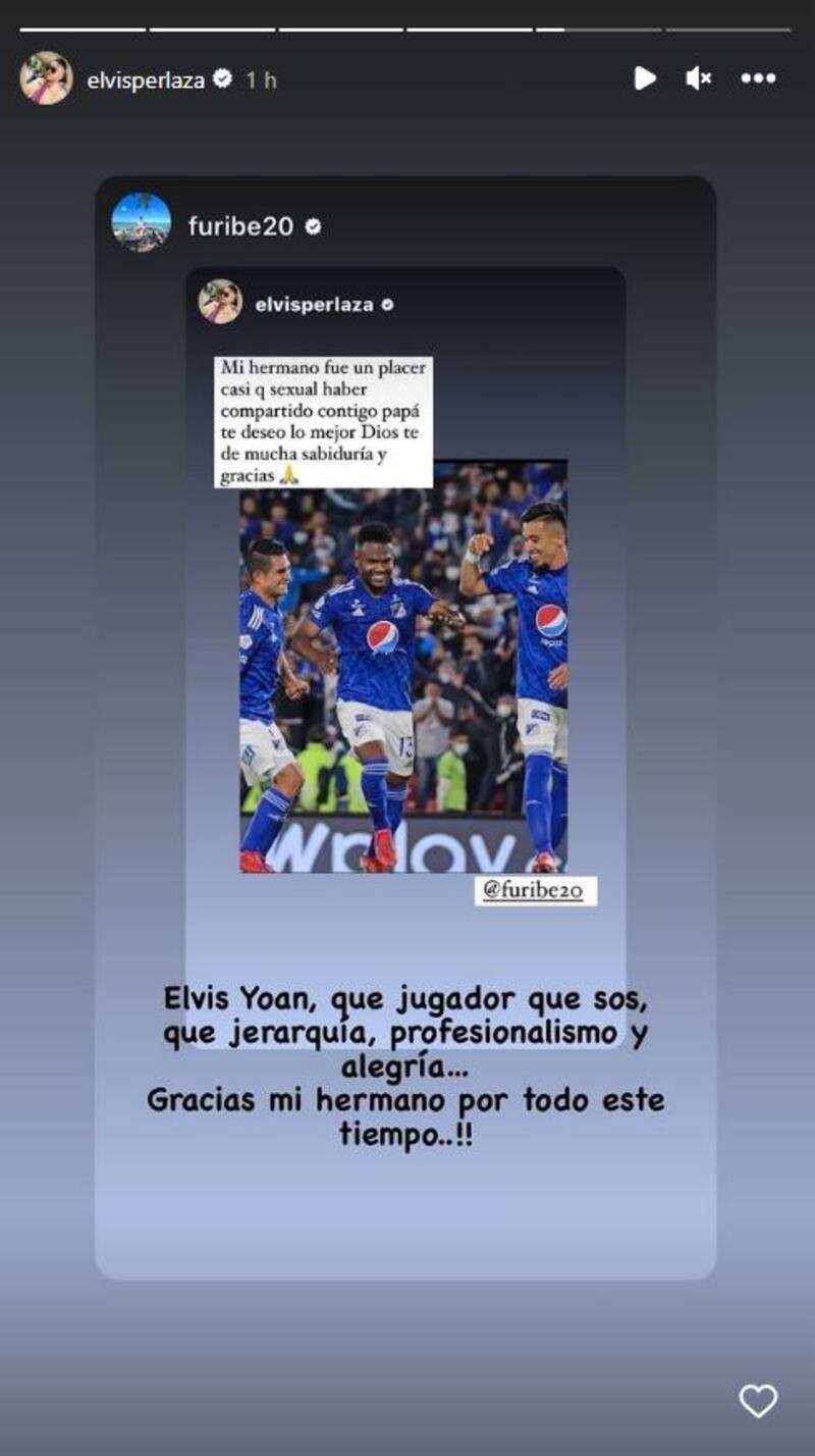 Pero el goleador no se quedó con el saludo, eso sí, con un tono de mayor seriedad, le respondió a su compañero: “Elvis Yoan, qué jugador que sos, qué jerarquía, profesionalismo y alegría… Gracias, mi hermano por todo este tiempo”.