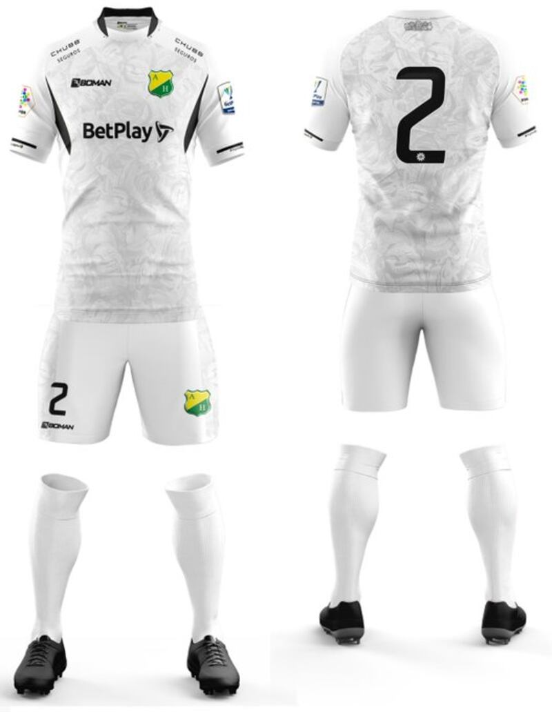 El uniforme es en su mayoría blanco, tanto camiseta, pantaloneta y medias, con el cuello negro y unos bisos laterales, también negros en la camiseta.