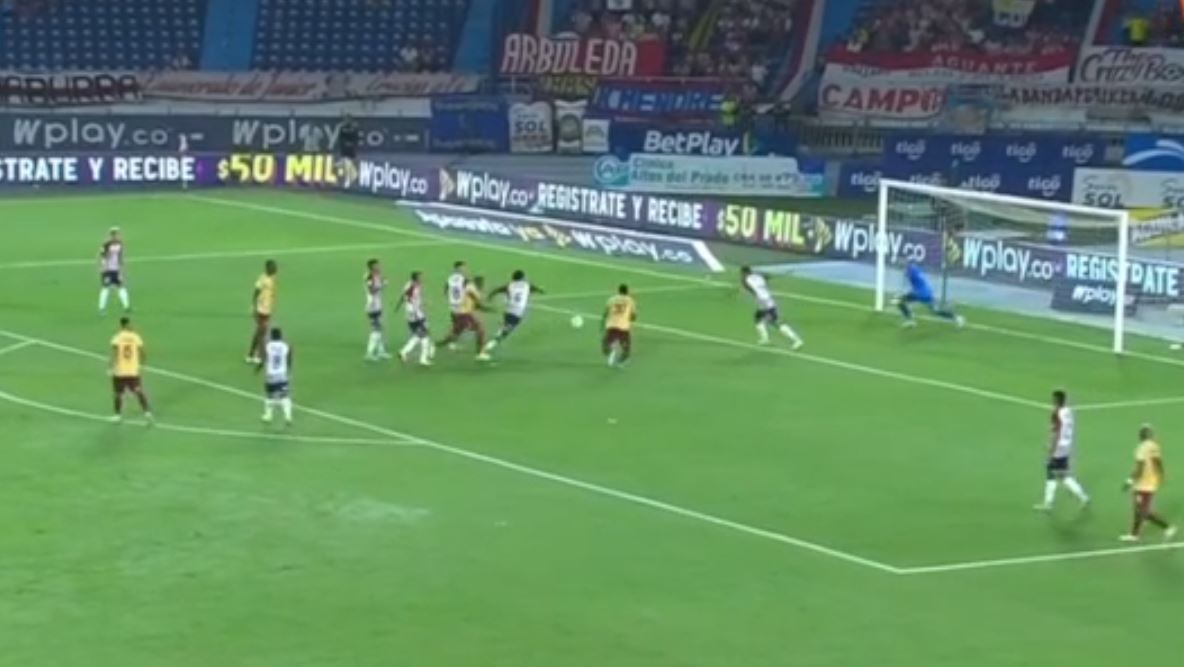 En un balón que quedó pagando en el área de Junior, Carlos Bacca intentó despejar con gran potencia, sin embargo, su disparo fue directo a su compañero Didier Moreno y de rebote el balón terminó en el fondo de su propio arco.