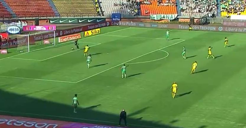 Sobre los 18 minutos, cuando recibió un pase atrás, el guardameta de Atlético Nacional quiso salir con categoría de su área, pero metió fue tremendo susto.