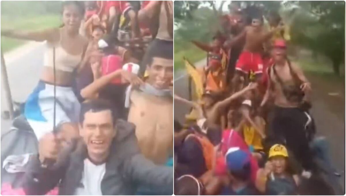En las imágenes se observa a un grupo de jóvenes en el trailer de una tractomula mientras algunos exhiben sus armas blancas que portan en su viaje.