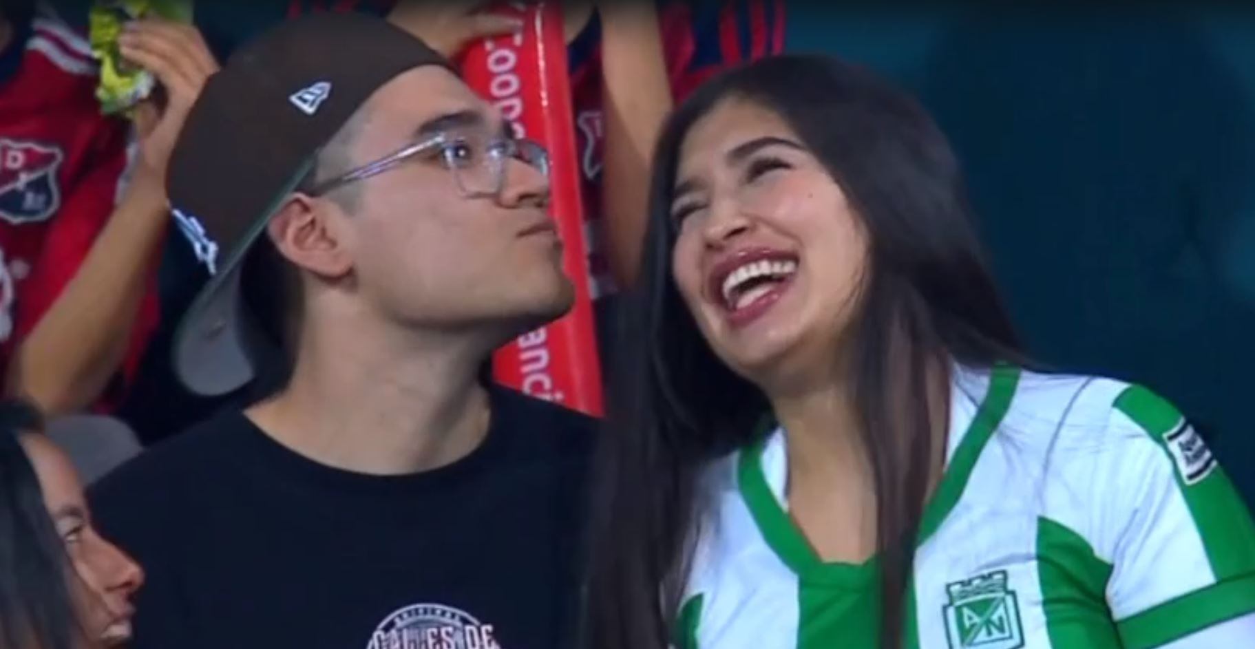 Una curiosa escena se dio en el entretiempo del clásico paisa en donde una mujer dejó iniciado a su acompañante que muy dispuesto esperaba a que le dieran su beso, pero ella no accedió.