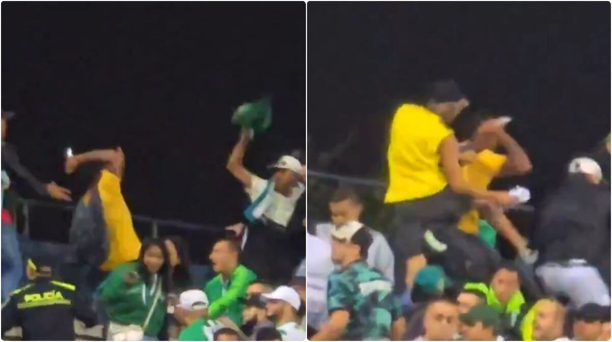 En primera medida, las imágenes dejan ver un pequeño grupo de hinchas de Junior que pasan a la zona de aficionados de Nacional que fueron repelidos y cuando parecía tranquilizarse la situación, aparece en escena un hombre de camiseta amarilla que termina desencadenando el caos.