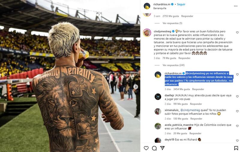 Dicha respuesta de Richard Ríos ha hecho enorme eco al no dejarse reprochar por el solo hecho de pintarse el cabello o usar tatuajes, dejando claro que si alguien no quiere que los jóvenes lo hagan, el mejor ejemplo empieza en casa.