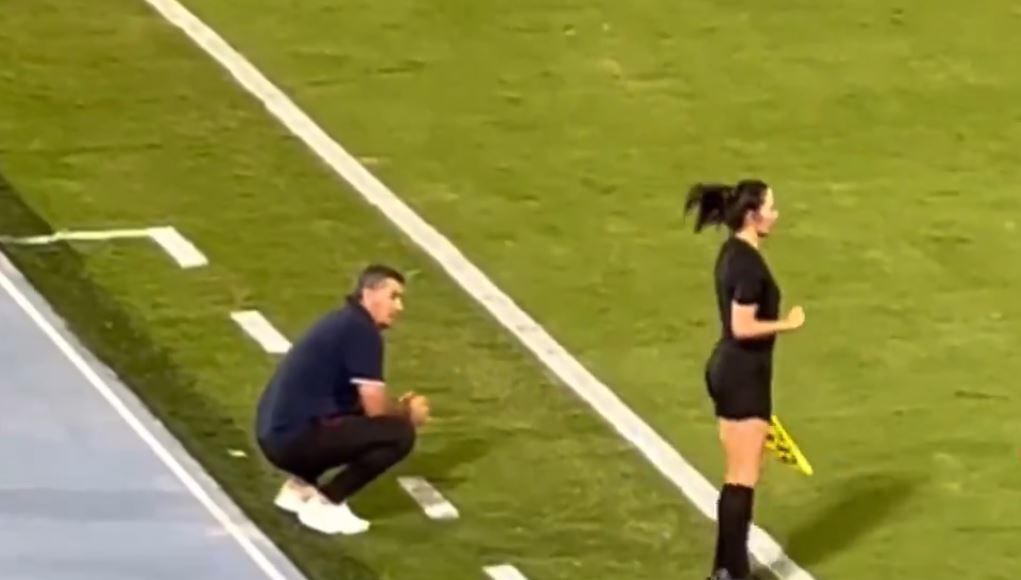 Un video aficionado dejó en evidencia la curiosa situación en la que el técnico de América está agachado al borde de la cancha cuando en frente de él pasa la Mary Blanco, la asistente arbitral número uno de ese compromiso que llamó toda su atención.