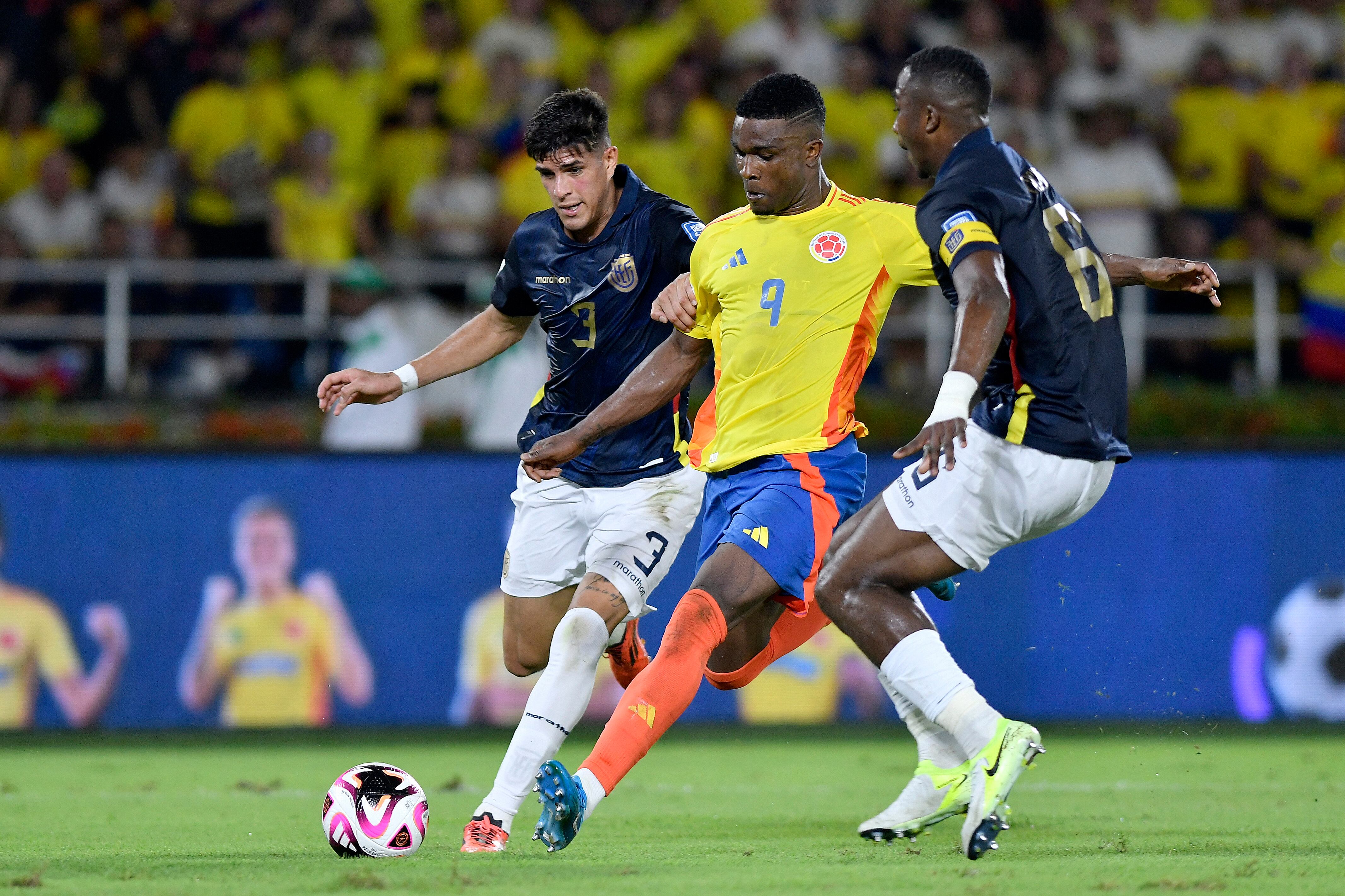 Los visitantes controlaron gran parte del primer tiempo, mientras la delantera de Colombia intentaba, hasta el minuto 34 cuando Jhon Córdoba se avivó ante un descuidado pase defensivo que incerceptó, luego eludió al arquero y cuando iba a definir, Piero Hincapié lo derribó a unos metros del área, entonces se ganó la tarjeta roja.