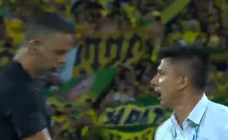 Carlos Ortega, árbitro que pitó la final de la Superliga entre Atlético Bucaramanga y Atlético Nacional vivió una incomoda situación de parte del técnico del equipo local, el paraguayo Gustavo Florentín, que literalmente lo apretó en plena cancha.