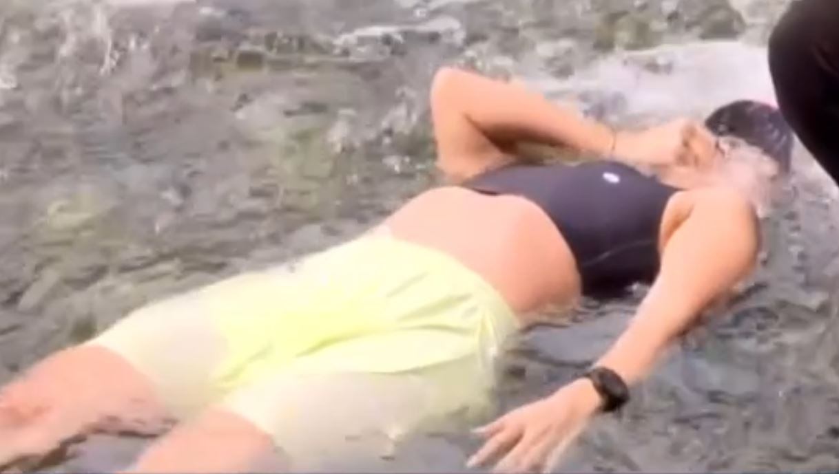 Allí, ella quiso hacer en directo una terapia de recuperación con un kinesiotaping en las aguas del río en donde se sumergió con toda tranquilidad.