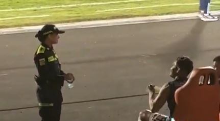 En pleno banco de suplentes, el experimentado atacante fue filmado más concentrado en su charla con una integrante de la Policía Nacional que en sus compañeros que disputaban el compromiso.