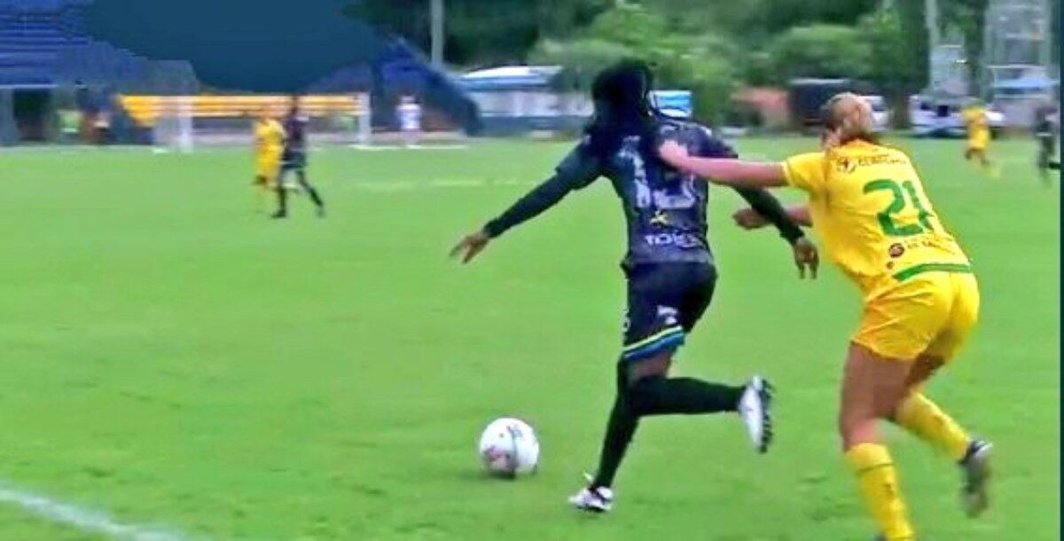 Fue sobre los 65 minutos que la número 13 del conjunto palmirano se escapó por la banda y al ver que se le marchaba, Bedoya tuvo la idea de frenarla con lo que tenía a la mano y eso fue el cabello del rival.