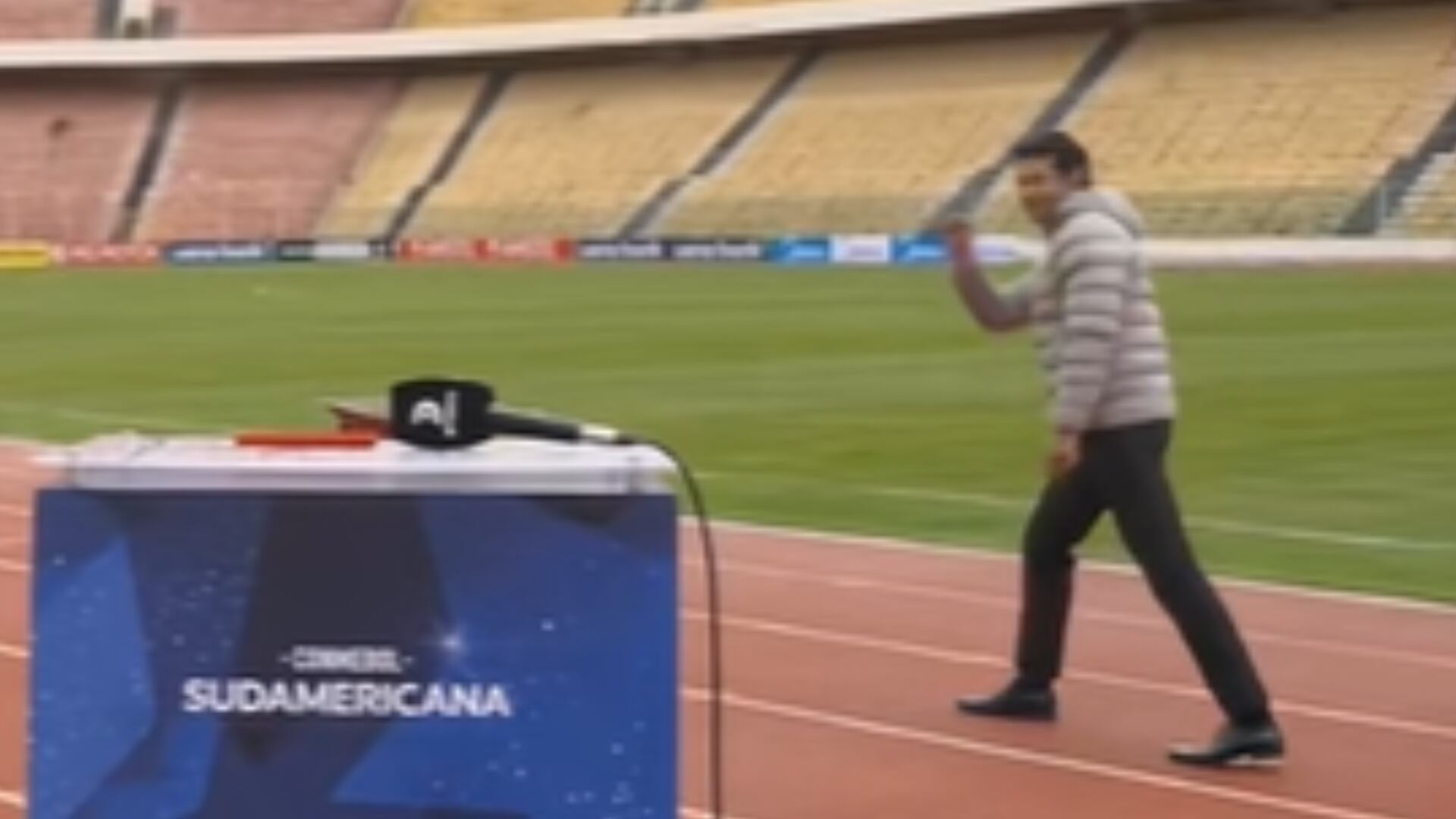 Entonces un periodista de DirecTV se le midió al reto de correr en el estadio y tuvo que pedir ayuda a sus compañeros en el set porque quedó ahogado.