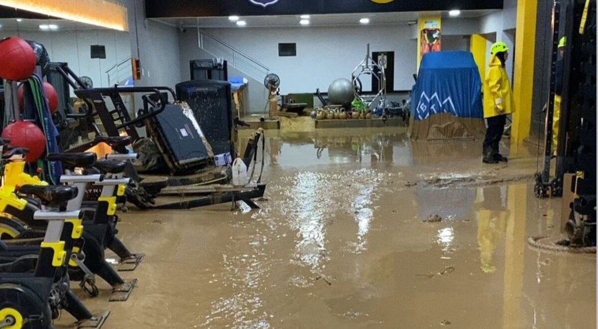 Las imágenes dejan ver la parte del gimnasio azotada por el agua y barro, además de la presencia de miembros del cuerpo de bomberos atendiendo la emergencia.