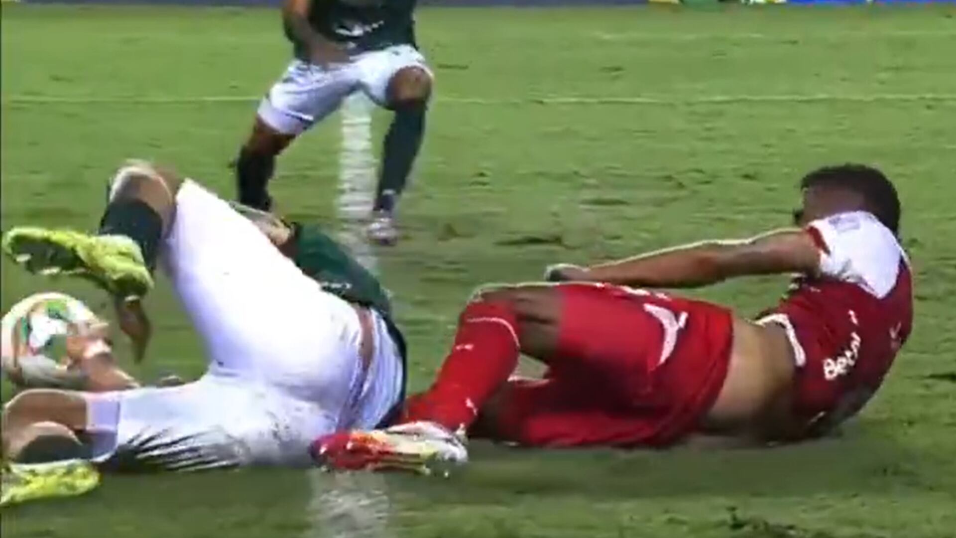 El futbolista del Cali terminó enredando a Meléndez y ambos terminaron en el piso. Por parte de Rodríguez fue solo la caída, pero en cuando a Meléndez fue peor, pues se le bajó la pantaloneta y dejó ver sus nalgas.