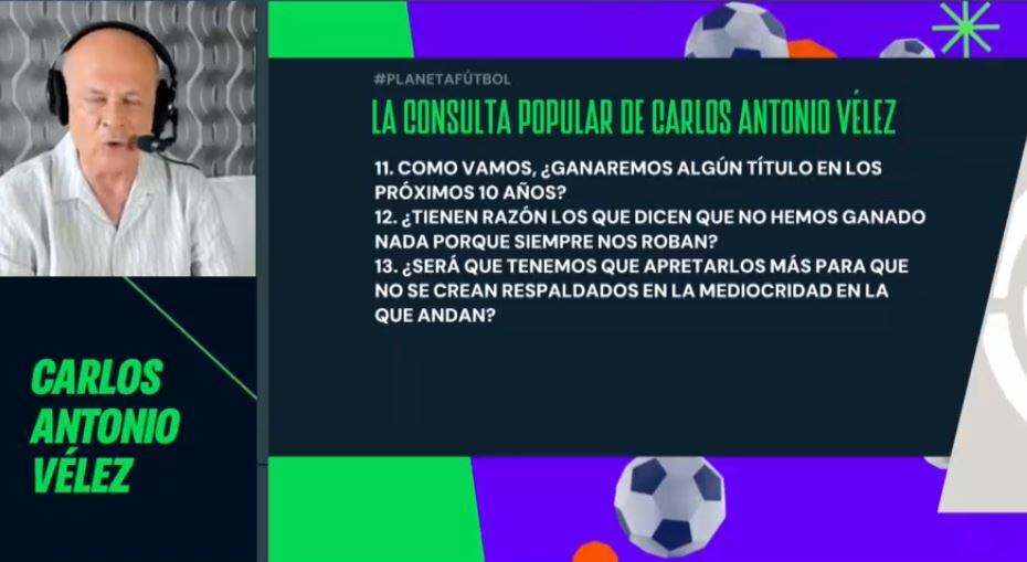 Carlos Antonio Vélez entró a la dinámica de la consulta popular, en alusión a la intención del gobierno nacional de realizar una acerca de reformas, pero la del periodista deportivo hizo alusión a la Selección Colombia.