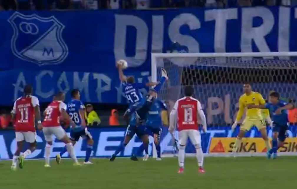 Para colmo de males, en la última jugada del partido hubo una evidente mano en el área de Millonarios, precedida de un despeje del mismo jugador (Marimón) que los jugadores de Santa Fe reclamaron como penal, el VAR llamó al árbitro Ortega para que la revisara, pero tras ver, el mismo decidió dar por terminado el juego.