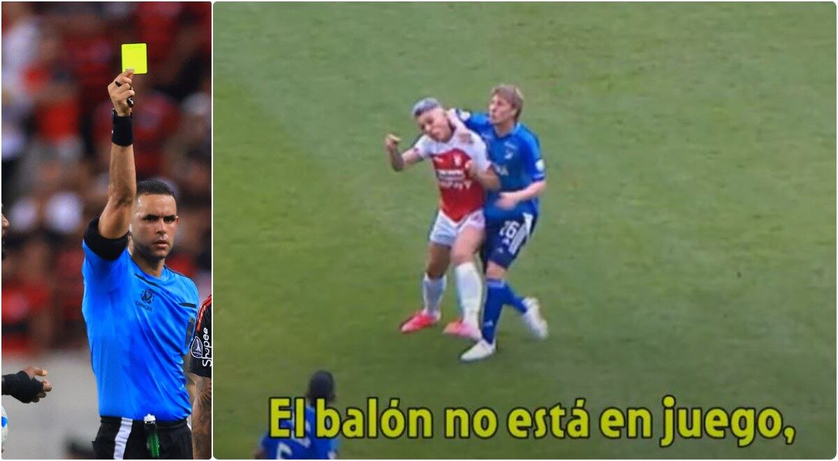 En su charla con el VAR, el árbitro Carlos Ortega señaló: “Veo claramente que lo golpea con el antebrazo en la parte del cuello. El balón no está en juego, pero le pega con el antebrazo en el cuello. Por lo tanto, voy con tiro libre directo y tarjeta amarilla”.