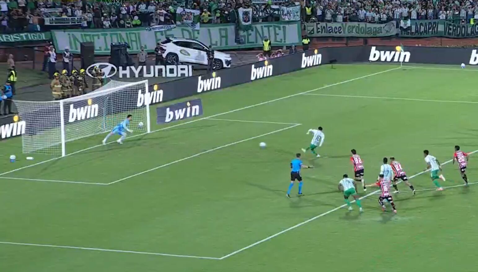 A pesar de esto, en medio del primer tiempo se dio una jugada que hubiera podido representar la ventaja por el club antioqueño, pues en medio de un ataque por banda de recha y el intento de remate de Marlos Moreno, mismo que terminó en la mano de un rival y de la cual surgió la pena máxima que decretó el juez central sin la necesidad de la ayuda del VAR, por lo que la afición verdolaga estalló en júbilo.