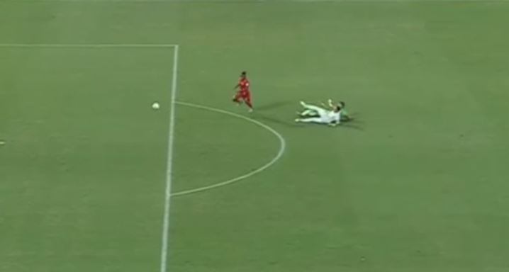 Fue sobre los 7 minutos de juego que un balón filtrado en largo picó en el campo del cuadro visitante y allí el portero David Ospina quiso salir a despejarlo muy fuera del área, sin embargo, su intento se vio frustrado al terminar chocando con su compañero Juan José Arias, que peinó el balón previamente y lo envió arriba del guardameta.