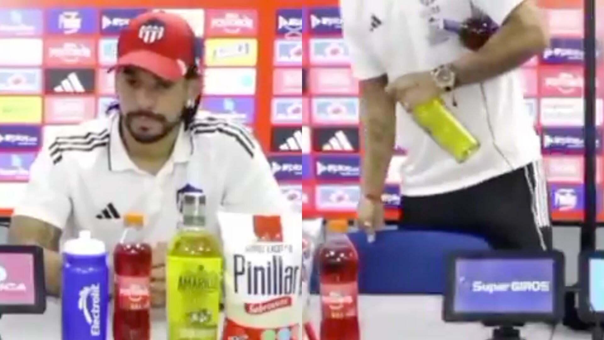 Justo en ese momento, el defensor paraguayo se detuvo para agarrar una botella de Aguardiente Amarillo y otra de Ron Caldas, desatando risas entre los asistentes a la sala y asegurando la celebración con sus compañeros o en su casa, todo esto sacando provecho de los patrocinadores del equipo que producen bebidas alcohólicas.